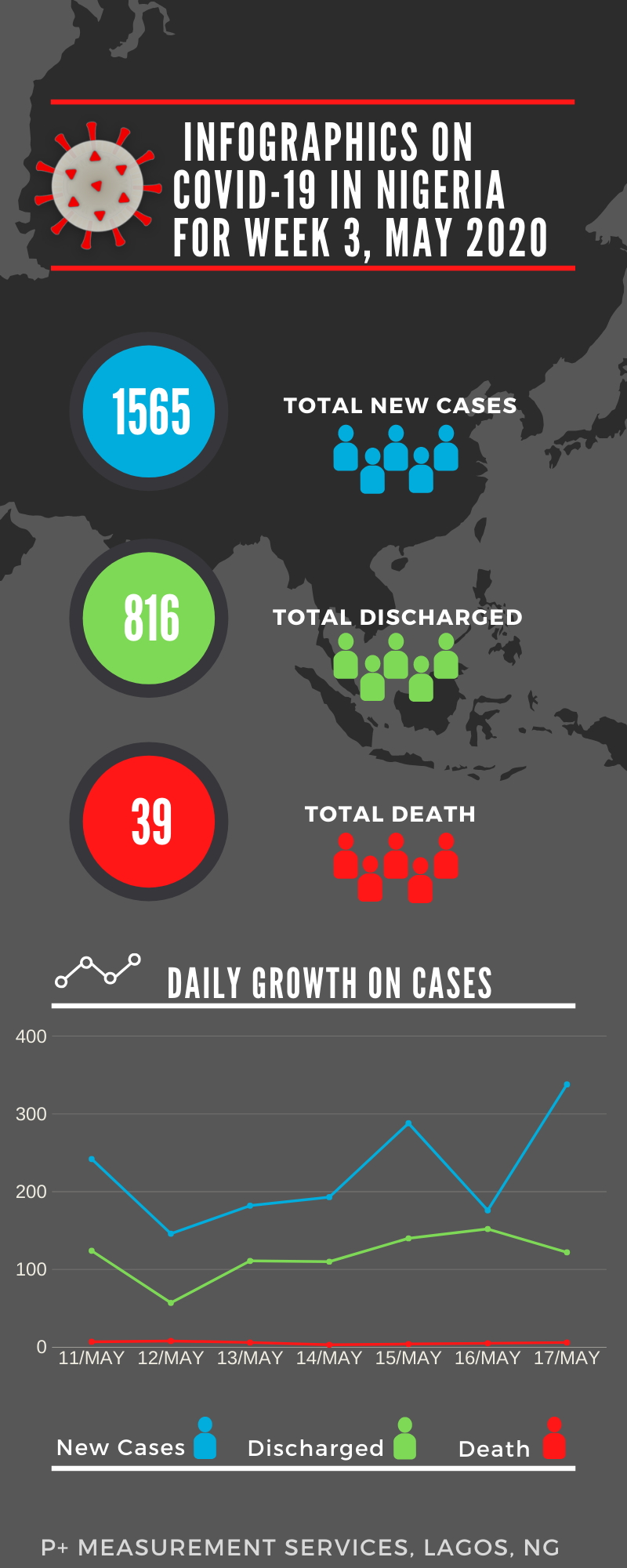 According to an analysis carried out by P+ Measurement services for week 3 of May, Nigeria recorded a total of 1565 new cases of the novel virus, 816 discharged cases and a total of 39 deaths were recorded, these records when compared to week 2 of the same month, could be seen that there is a decline in the number of new cases with a difference of 277, an increase in the number of discharged cases with a difference of 511 and a decrease in the number of deaths with a difference of 17.