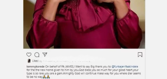 Kemi Korede in a now deleted post revealed that actress, Funke Akindele had intervened and put a smile on the face of her senior colleague and his family.