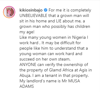 “It may be difficult for people like him to understand that a young woman can work hard and succeed on her own steam. Anyone can verify the ownership of the property of Glamd Africa at AGIS in Abuja. I am a tenant in the property. My landlord’s name is Musa Adams.”