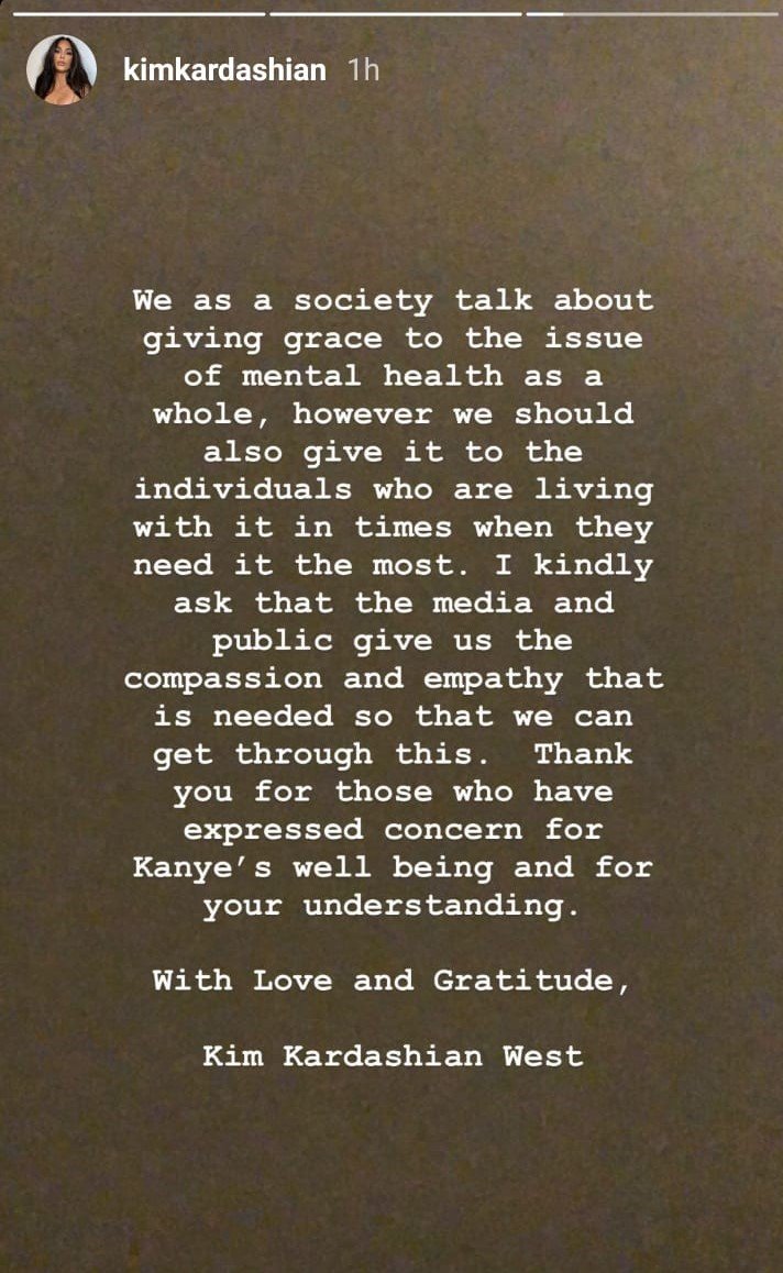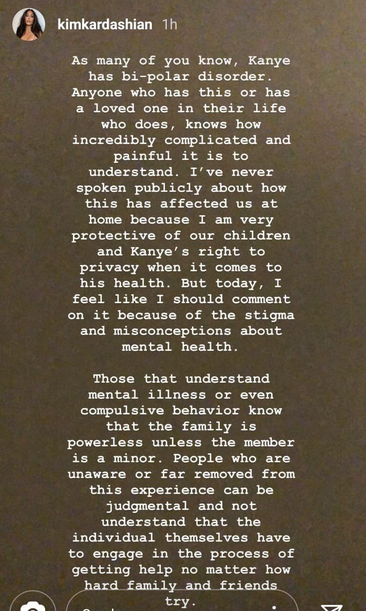I’ve never spoken publicly about how this has affected us at home because I am very protective of our children and Kanye’s right to privacy when it comes to his health. But today, I feel like I should comment on it because of the stigma and misconceptions about mental health.”