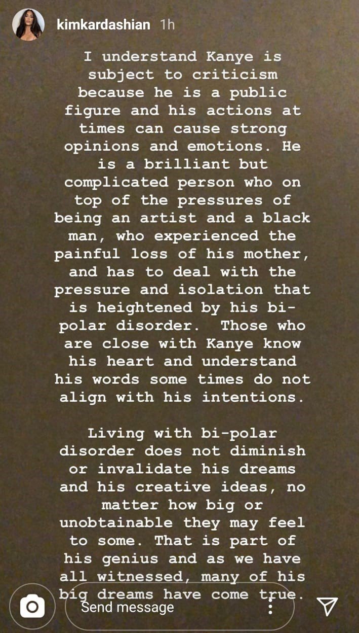 “I understand Kanye is subject to criticism because he is a public figure and his actions at time can cause strong opinions and emotions,” she continued. “He is a brilliant but complicated person who on top of being an artist and a black man, who experienced the painful loss of his mother, and has to deal with the pressure and isolation that is heightened by his bi-polar disorder. Those who are close with Kanye know his heart and understand his words sometimes do not align with his intentions.”