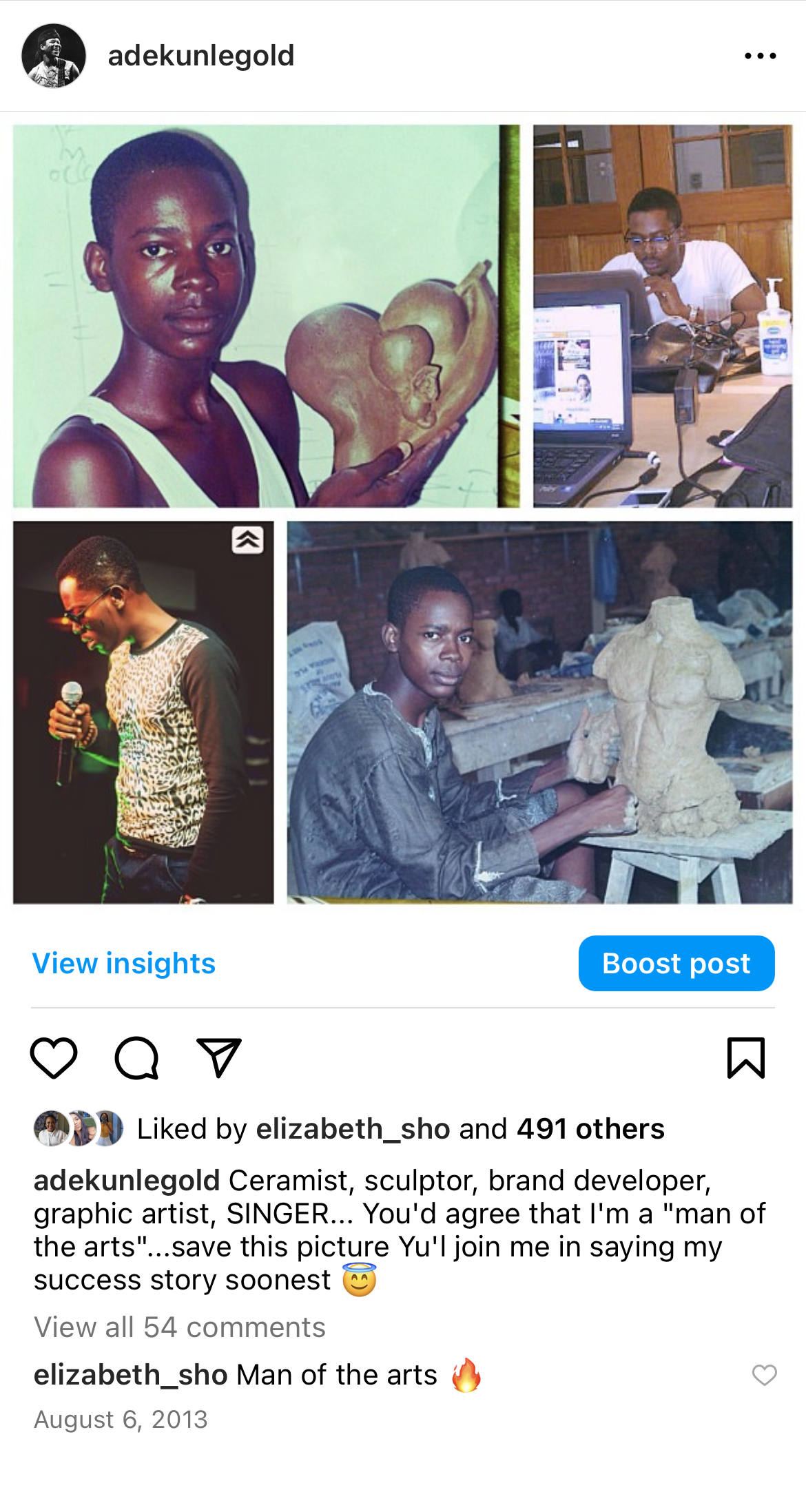 August 6, 2013, I tweeted and posted this on Instagram “Ceramist, sculptor, brand developer, graphic artist, SINGER. You’d agree that I am a “man of the arts”…save this picture you will join me in saying my success story soonest”. (See screenshot below)