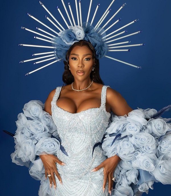 The sky-blue Ann Usman dress had intricate beading in a simple mermaid cut. She paired the look with silver high-heeled sandals and accessories and crowned it with a sleek centre-part ponytail and silver and blue headpiece.