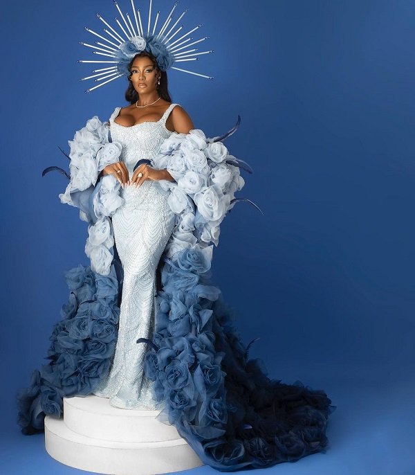 Following the Eko Royalty theme, her gorgeous dress had a blue ombré off-shoulder cape that doubled as a train.
