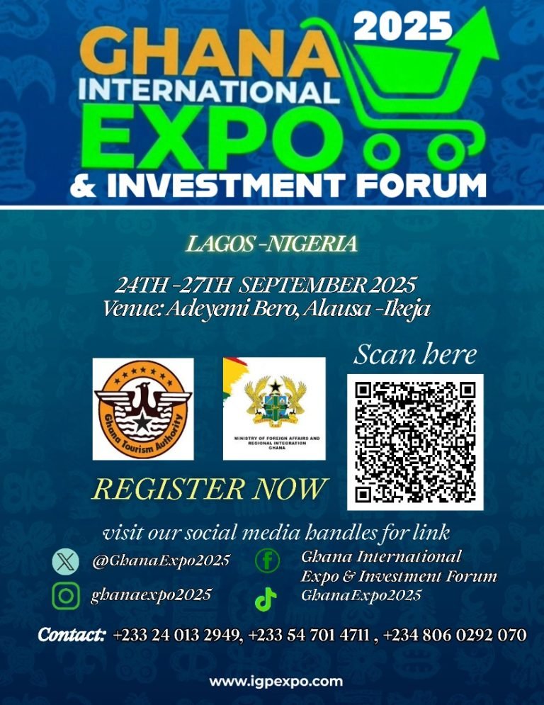 The Expo will be held in Adeyemi Bero, Alausa Ikeja Lagos Nigeria from 24th-27th September 2025, bringing together Ghanaian entrepreneurs, investors, policymakers, and international business leaders. This highly anticipated event is being organized under the theme: ‘Unlocking Investment Potential Through Intra-African Trade and Tourism’