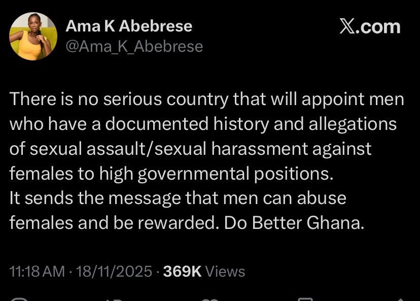 “There is no serious country that will appoint men who have a documented history and allegations of sexual assault/sexual harassment against females to high governmental positions,” Abebrese tweeted. “It sends the message that men can abuse females and be rewarded. Do Better Ghana.”