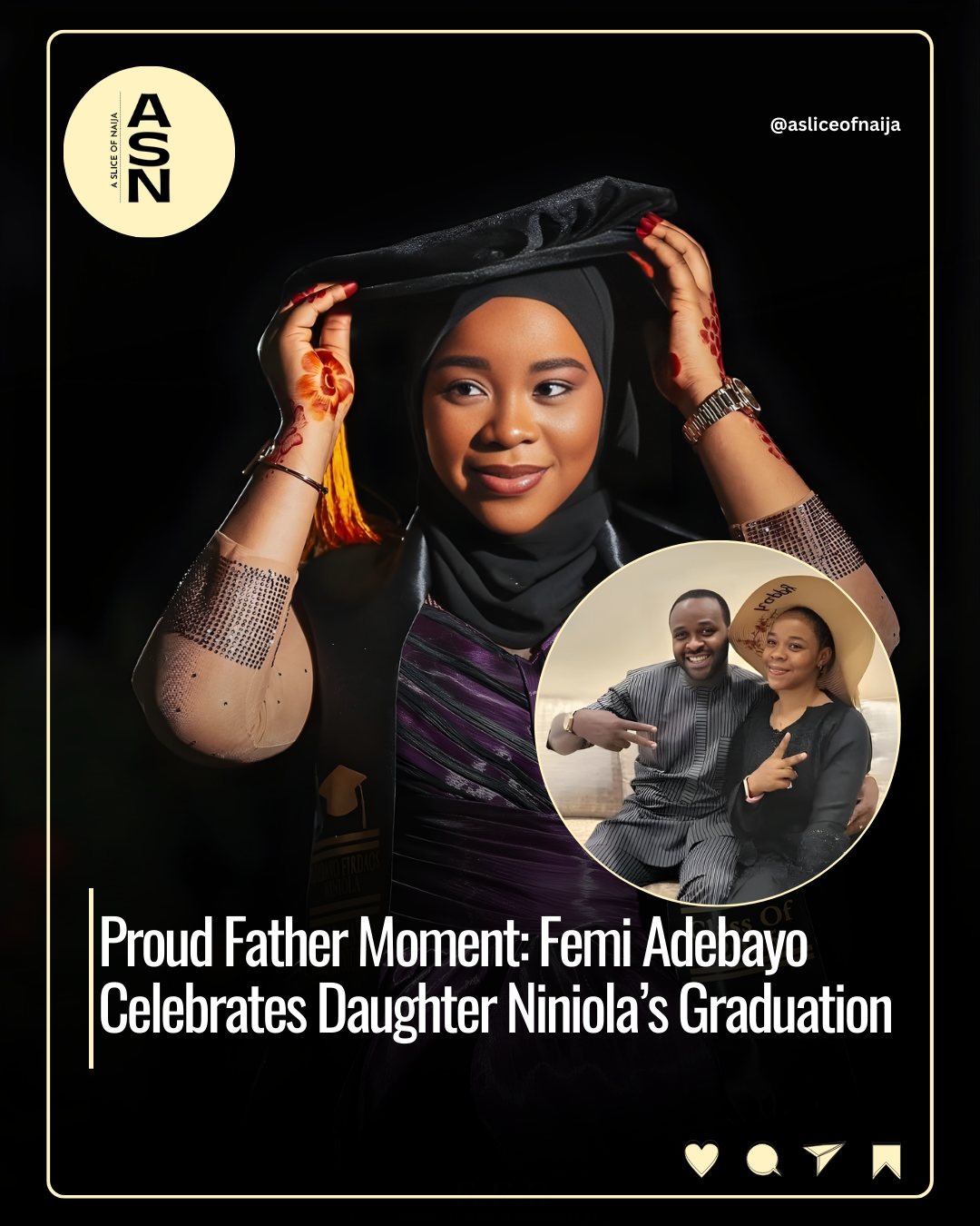 Nollywood actor and filmmaker Femi Adebayo has marked a major family milestone as his daughter and first child, Niniola Ajoke Firdaos, officially graduated from Al-Hikmah University with a Bachelor of Science degree in Mass Communication.