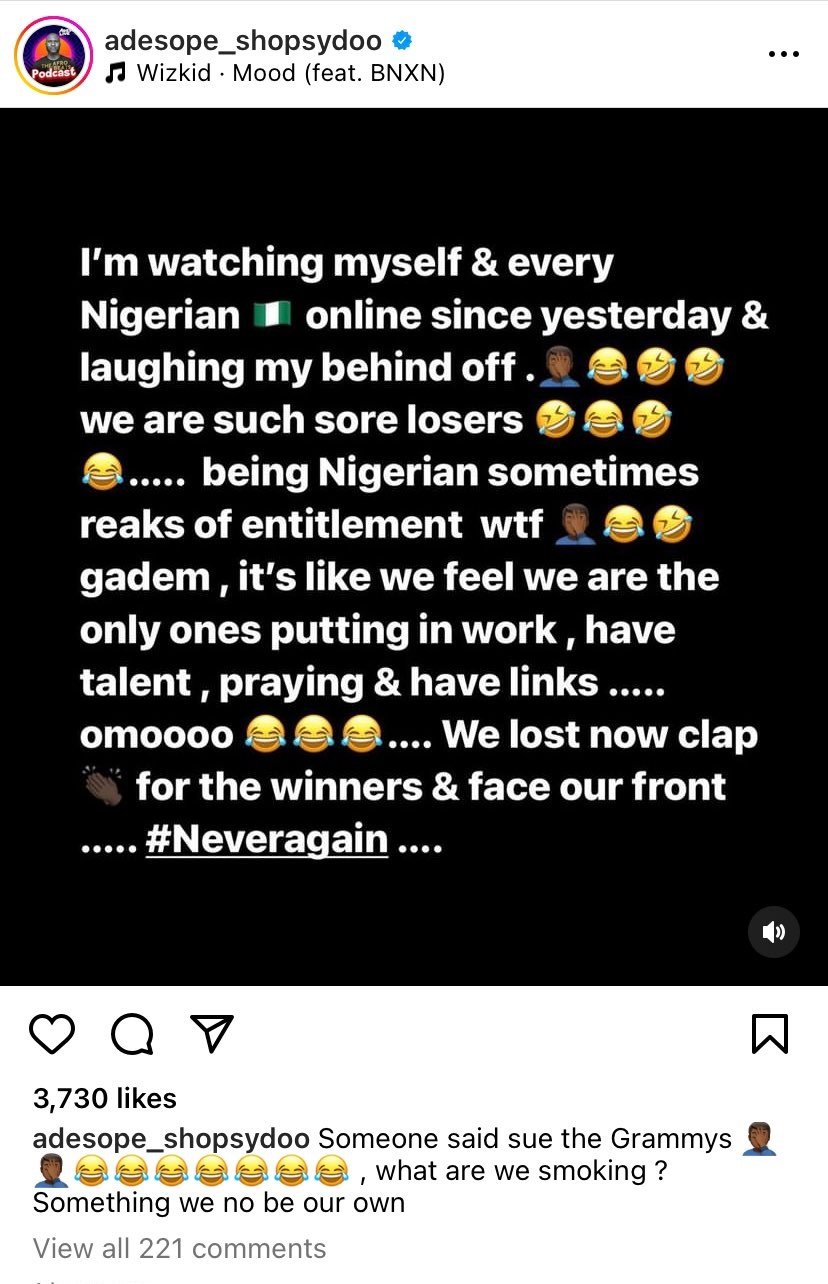 In the aftermath of the 2026 Grammy Awards, Nigerian Afrobeats promoter Adesope has taken to Instagram to address what he describes as the entitlement culture among some Nigerians online.